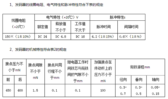 FJ-1 FJ-4繼電式發(fā)碼器用于站內股道的側線電碼化,是股道側線電碼的始發(fā)器件3、發(fā)碼器接點應同事斷開與閉合,其不同時接觸誤差不得大于0.2mm.4、發(fā)碼器接點接觸電阻應不大于0.19.5、在溫度為+ 15*C~+35*C ,相對濕度為45%~80%時,發(fā)碼器和插座的絕緣電阻均應不小于100MQ。6、在氣壓不低于86kPa條件下(相當于海拔高度1000m以下) , 發(fā)碼器絕緣耐壓應能承受交流正弦波50Hz、效值1000V電壓,歷時1min應無擊穿或閃絡現(xiàn)象。重復實驗時的試驗電壓值應為原試驗電壓的75%.7、發(fā)碼器接點通以220V、1.5A的阻性負載 ,每分鐘動作40~50次,可連續(xù)動作1x 107次。